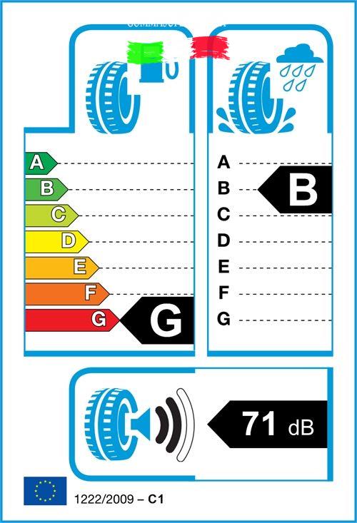 Gli pneumatici sono classificati nell’etichettatura dei pneumatici UE secondo tre caratteristiche di performance: l’efficienza del combustibile(lettere da A a G), l’aderenza a umido (lettere da A a G) ed esterna emissione rumore (decibel).