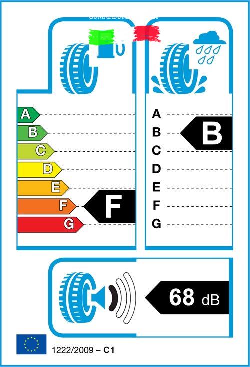 Gli pneumatici sono classificati nell’etichettatura dei pneumatici UE secondo tre caratteristiche di performance: l’efficienza del combustibile(lettere da A a G), l’aderenza a umido (lettere da A a G) ed esterna emissione rumore (decibel).