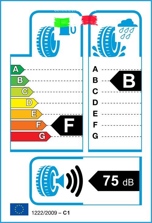 Gli pneumatici sono classificati nell’etichettatura dei pneumatici UE secondo tre caratteristiche di performance: l’efficienza del combustibile(lettere da A a G), l’aderenza a umido (lettere da A a G) ed esterna emissione rumore (decibel).