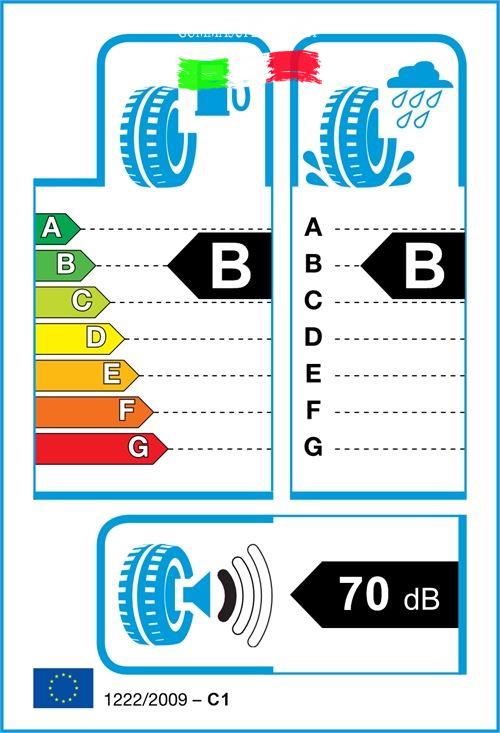 Gli pneumatici sono classificati nell’etichettatura dei pneumatici UE secondo tre caratteristiche di performance: l’efficienza del combustibile(lettere da A a G), l’aderenza a umido (lettere da A a G) ed esterna emissione rumore (decibel).