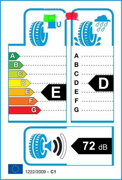 Gli pneumatici sono classificati nell’etichettatura dei pneumatici UE secondo tre caratteristiche di performance: l’efficienza del combustibile(lettere da A a G), l’aderenza a umido (lettere da A a G) ed esterna emissione rumore (decibel).