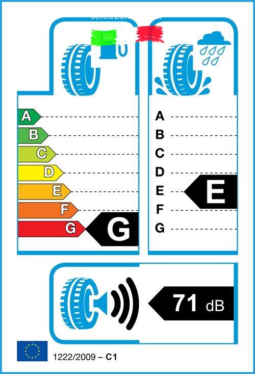 Gli pneumatici sono classificati nell’etichettatura dei pneumatici UE secondo tre caratteristiche di performance: l’efficienza del combustibile(lettere da A a G), l’aderenza a umido (lettere da A a G) ed esterna emissione rumore (decibel).