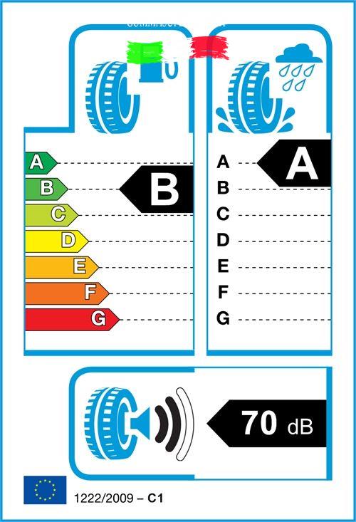 Gli pneumatici sono classificati nell’etichettatura dei pneumatici UE secondo tre caratteristiche di performance: l’efficienza del combustibile(lettere da A a G), l’aderenza a umido (lettere da A a G) ed esterna emissione rumore (decibel).