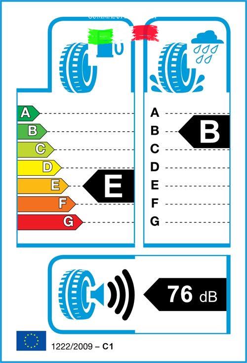 Gli pneumatici sono classificati nell’etichettatura dei pneumatici UE secondo tre caratteristiche di performance: l’efficienza del combustibile(lettere da A a G), l’aderenza a umido (lettere da A a G) ed esterna emissione rumore (decibel).