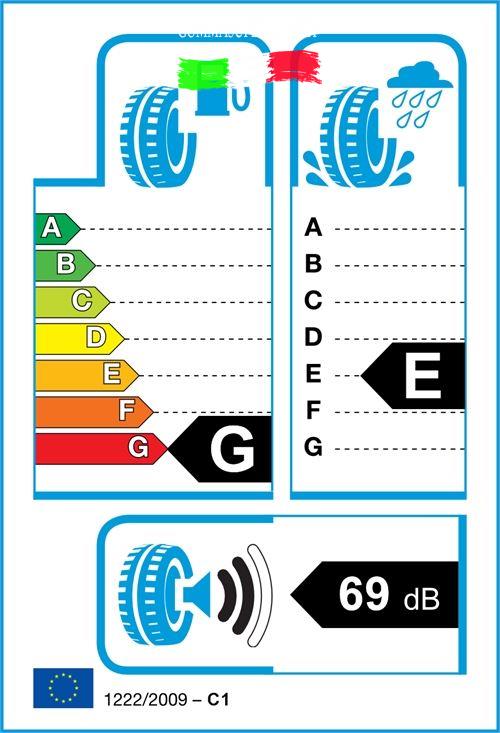 Gli pneumatici sono classificati nell’etichettatura dei pneumatici UE secondo tre caratteristiche di performance: l’efficienza del combustibile(lettere da A a G), l’aderenza a umido (lettere da A a G) ed esterna emissione rumore (decibel).